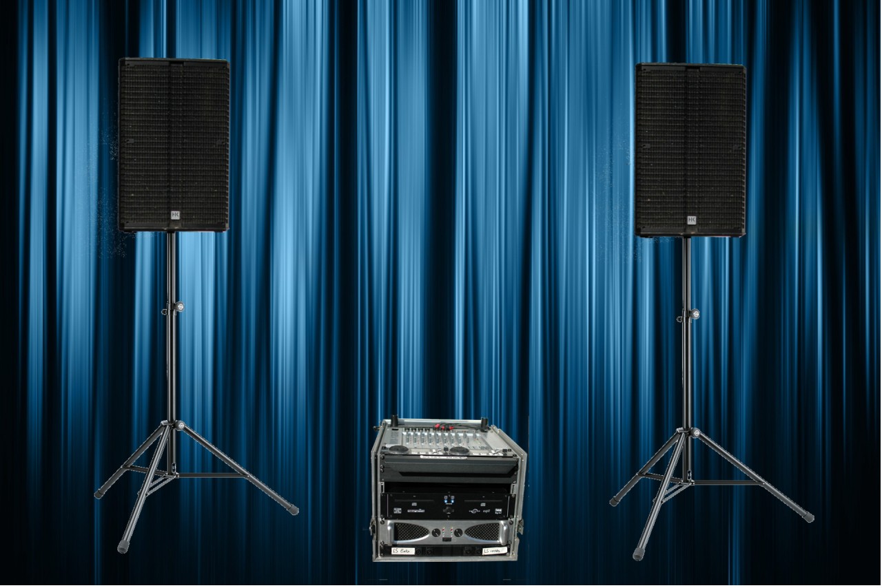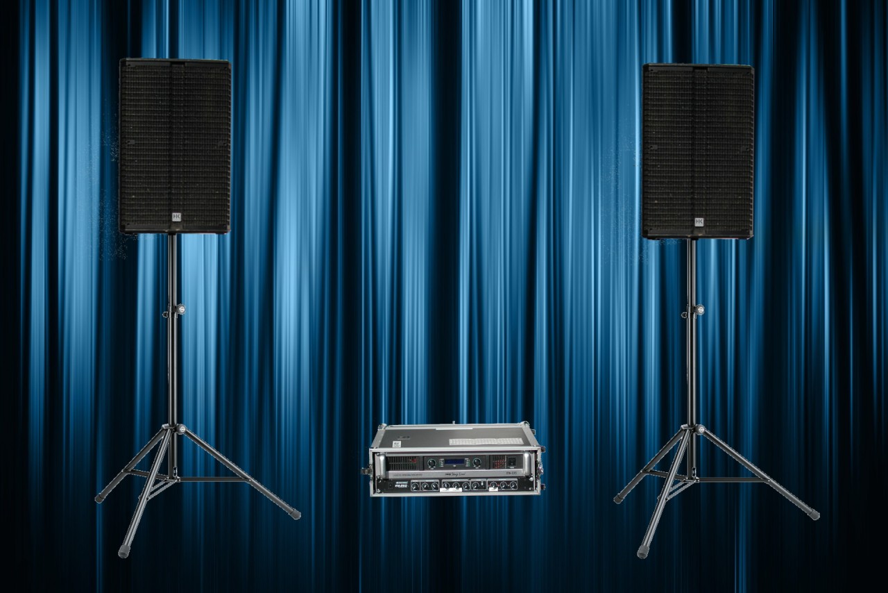 2 Lautsprechern HK Linear:Pro 15 mit Stativen und Kabeln