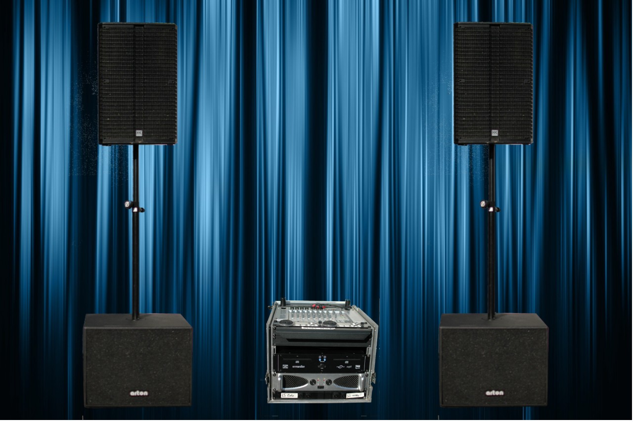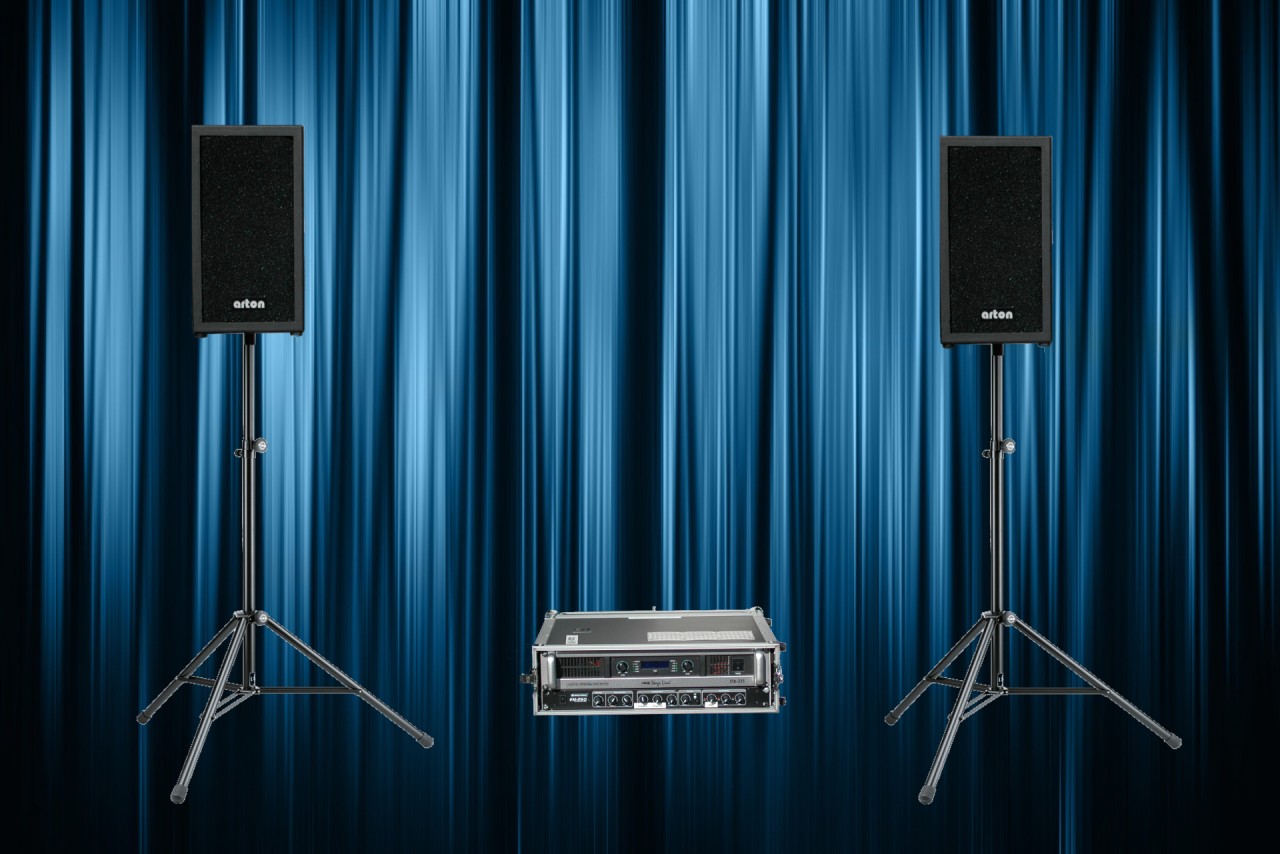 2 Lautsprechern arton S10 mit Stativen und Kabeln